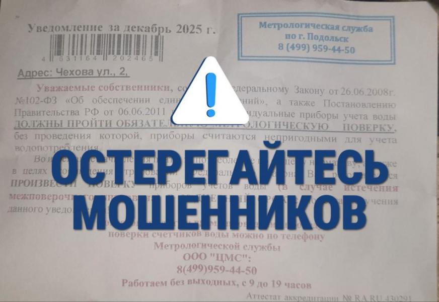 В преддверии Новогодних праздников в МУП «Водоканал» г. Подольска поступают обращения от жителей о навязывании им услуг по поверке и замене счётчиков воды. Неизвестные лица рассылают уведомления, ходят по квартирам и, представляясь сотрудниками «метрологических служб», Водоканала или управляющих компаний, пугают штрафами и отключением воды. Их цель — замена, как правило, исправных приборов по завышенной цене.